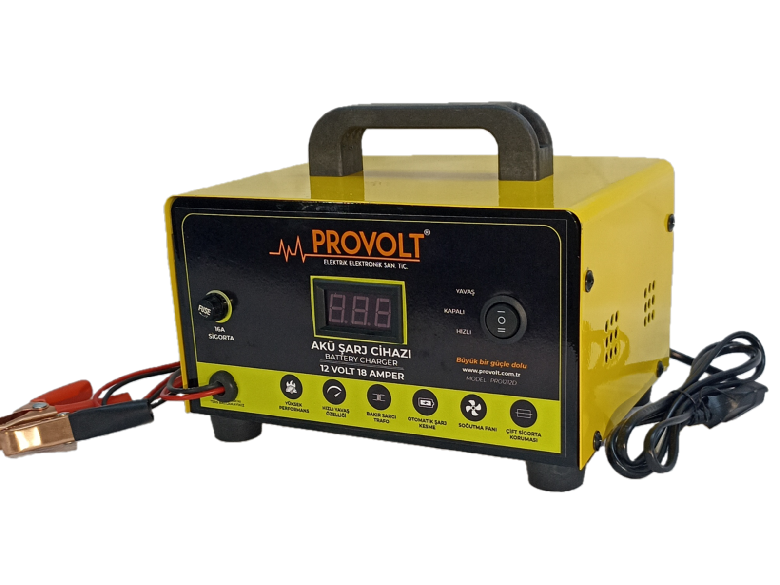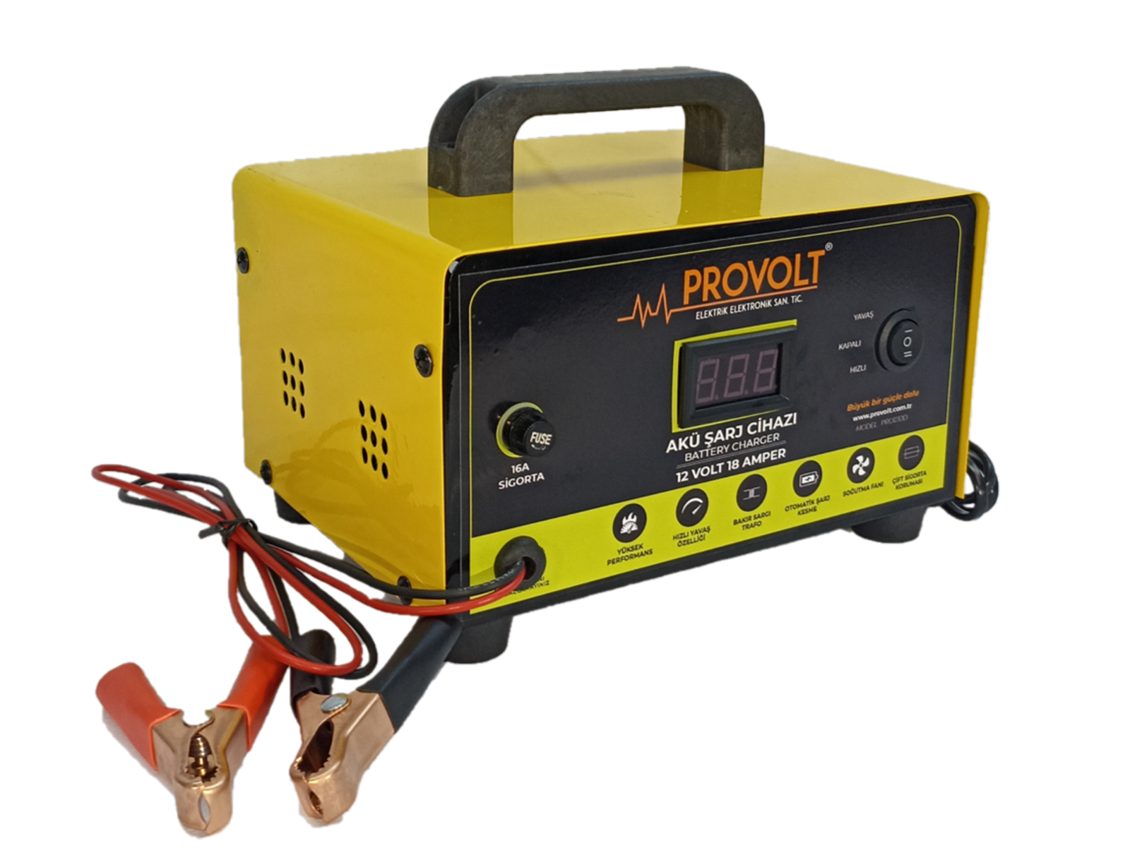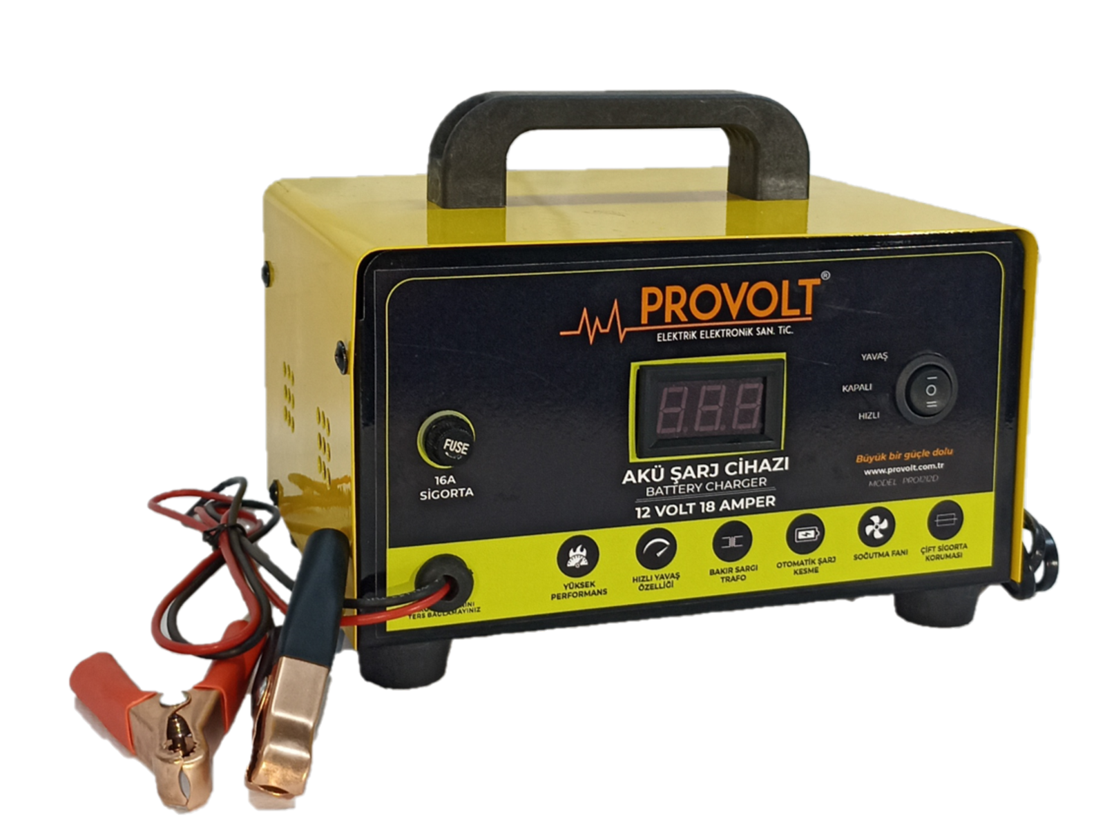 PROVOLT marka 12V 18A  Akü Şarj Cihazı, araba akülerinizi rahatça şarj edebileceğiniz, dayanıklı metal yapısı ile kullanışı rahat bir şarj cihazıdır. Yalıtımlı yapısı ve çelik sac gövdesi ile 12 V’luk bir şarj cihazıdır.